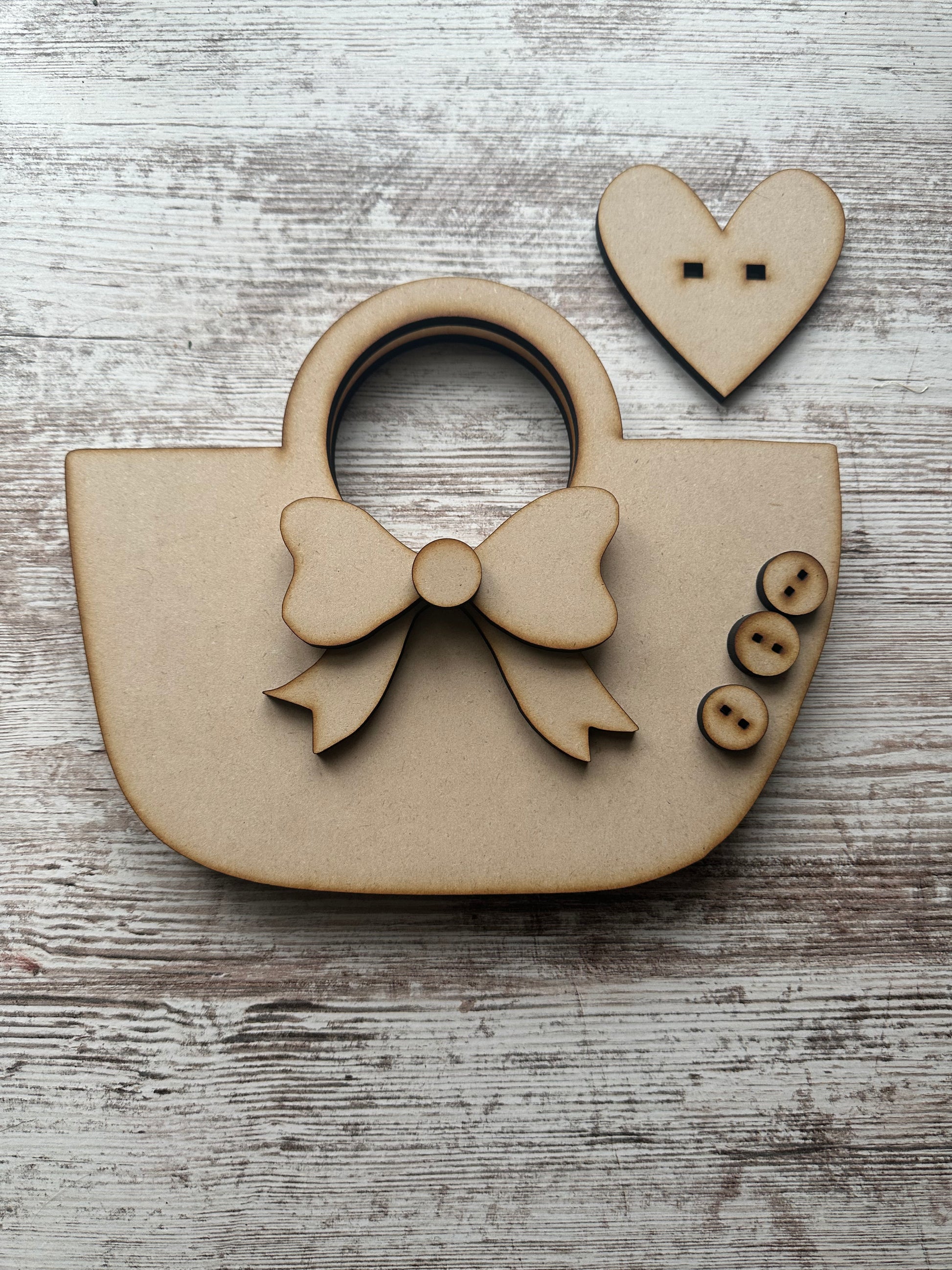 This kit is made using 1/4" MDF and comes unfinished with all accessories shown in photo. The kit will come with two spacers to use in between both basket pieces so you can add some greenery stems at the top to decorate.