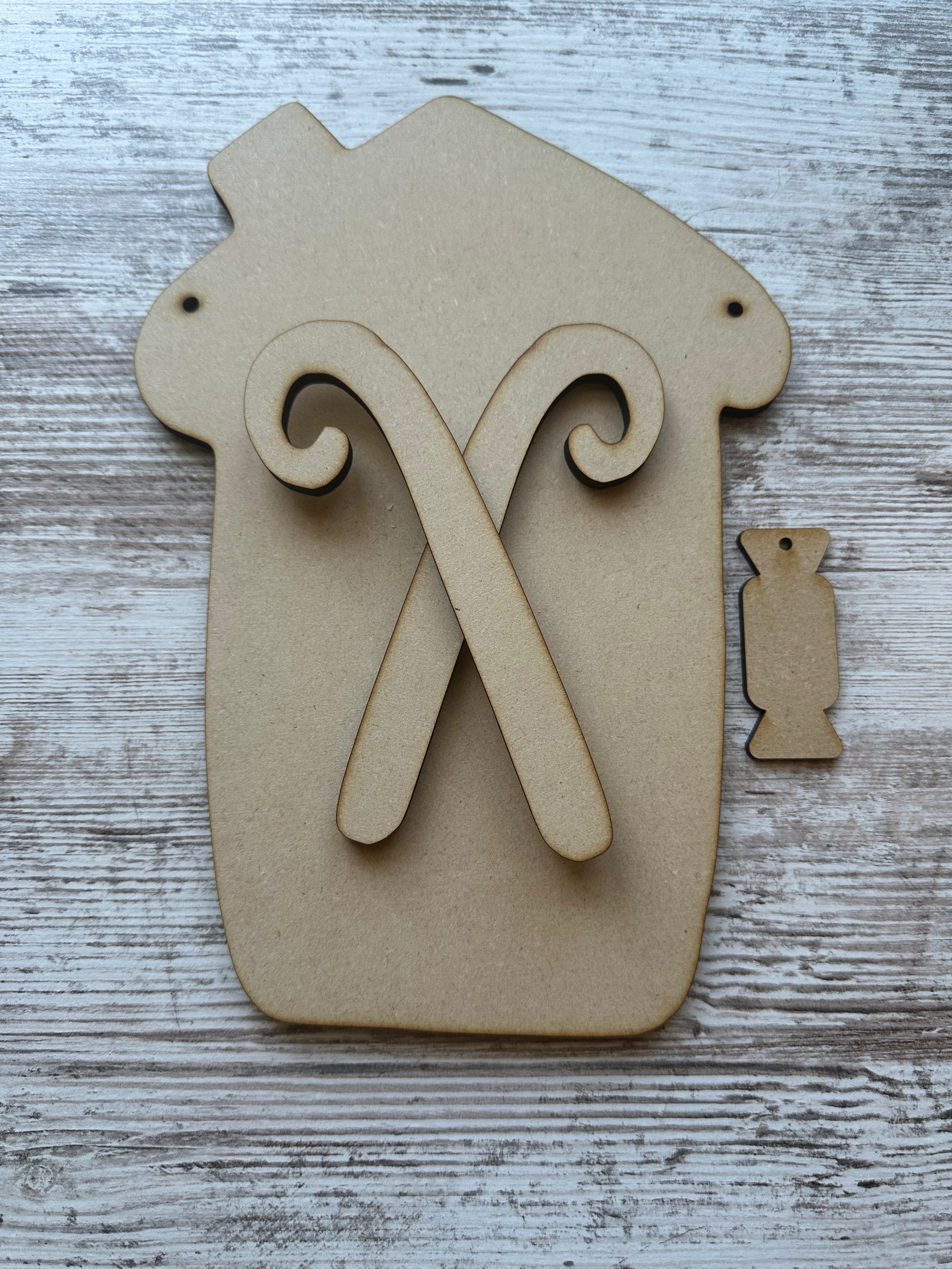 This kit is made using 1/4" and 1/8" MDF and comes unfinished. Kit comes with three circle spacers for under one of the candy canes for better support if you criss cross them.